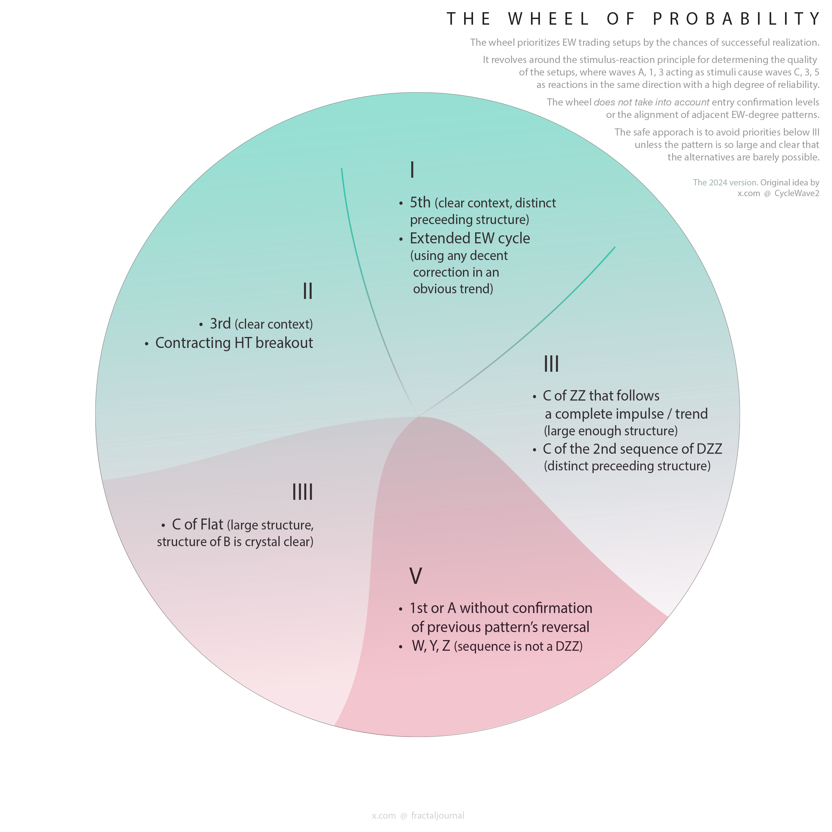 The wheel prioritizes Elliott Wave trading setups by the chances of successful realization.