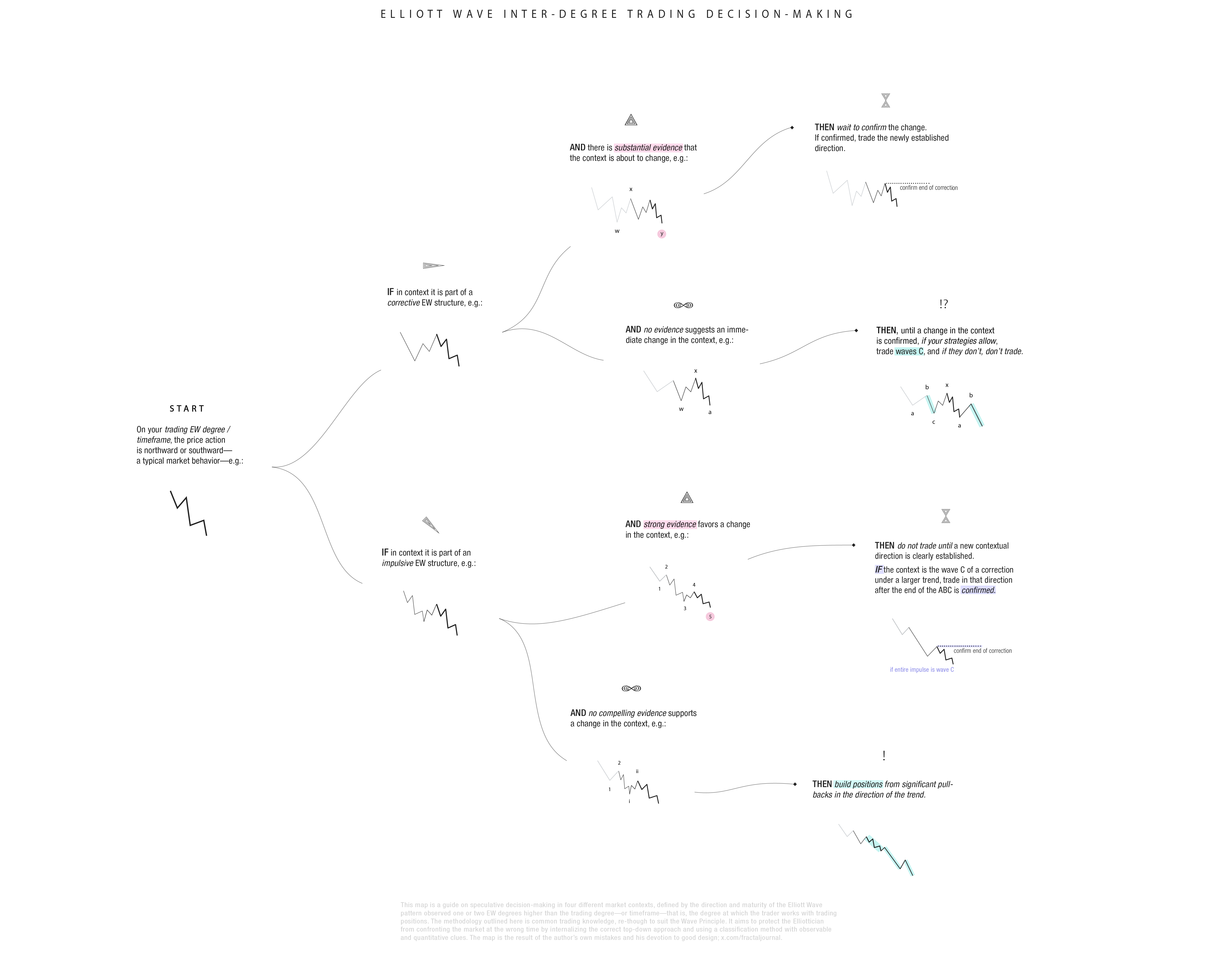 This map is a guide on speculative decision-making in four different market contexts, defined by the direction and maturity of the Elliott Wave pattern . . .